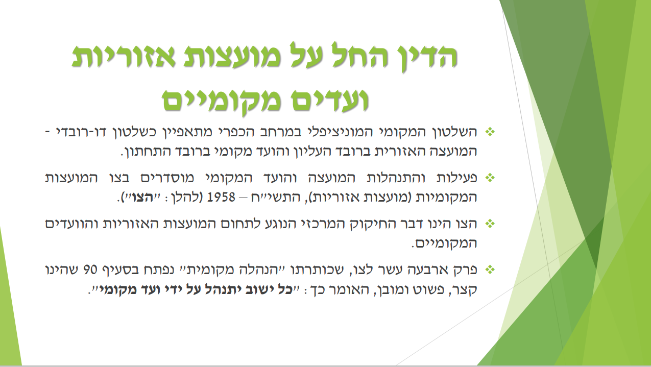 הרצאה מס' 1 בסדרת הרצאות שהועברה במסגרת הקורס "היבטים בניהול היישוב הכפרי", אשר הועבר ע"י משרדנו בשיתוף תנועת אור ומשרד הכלכלה במרץ 2017